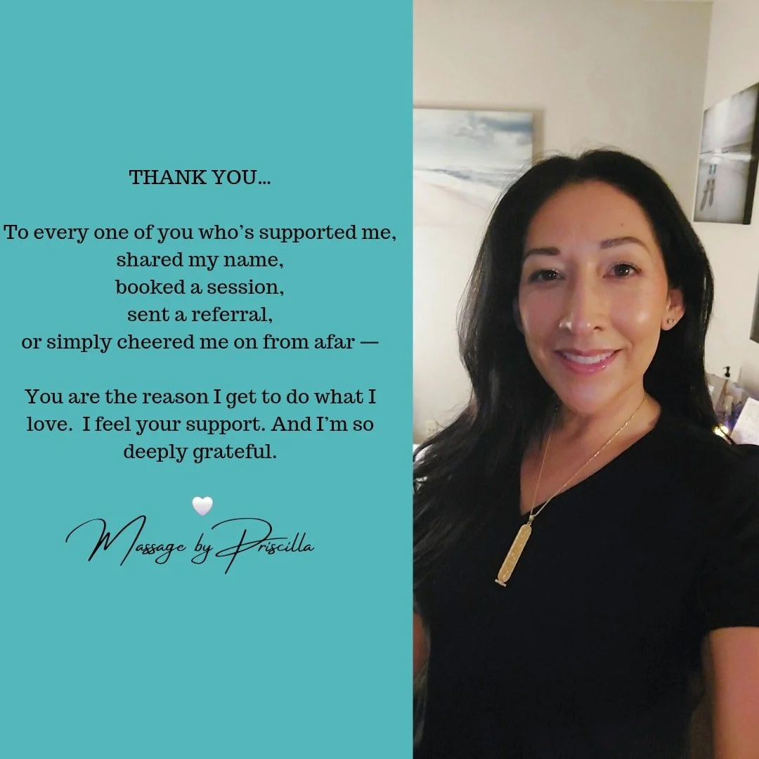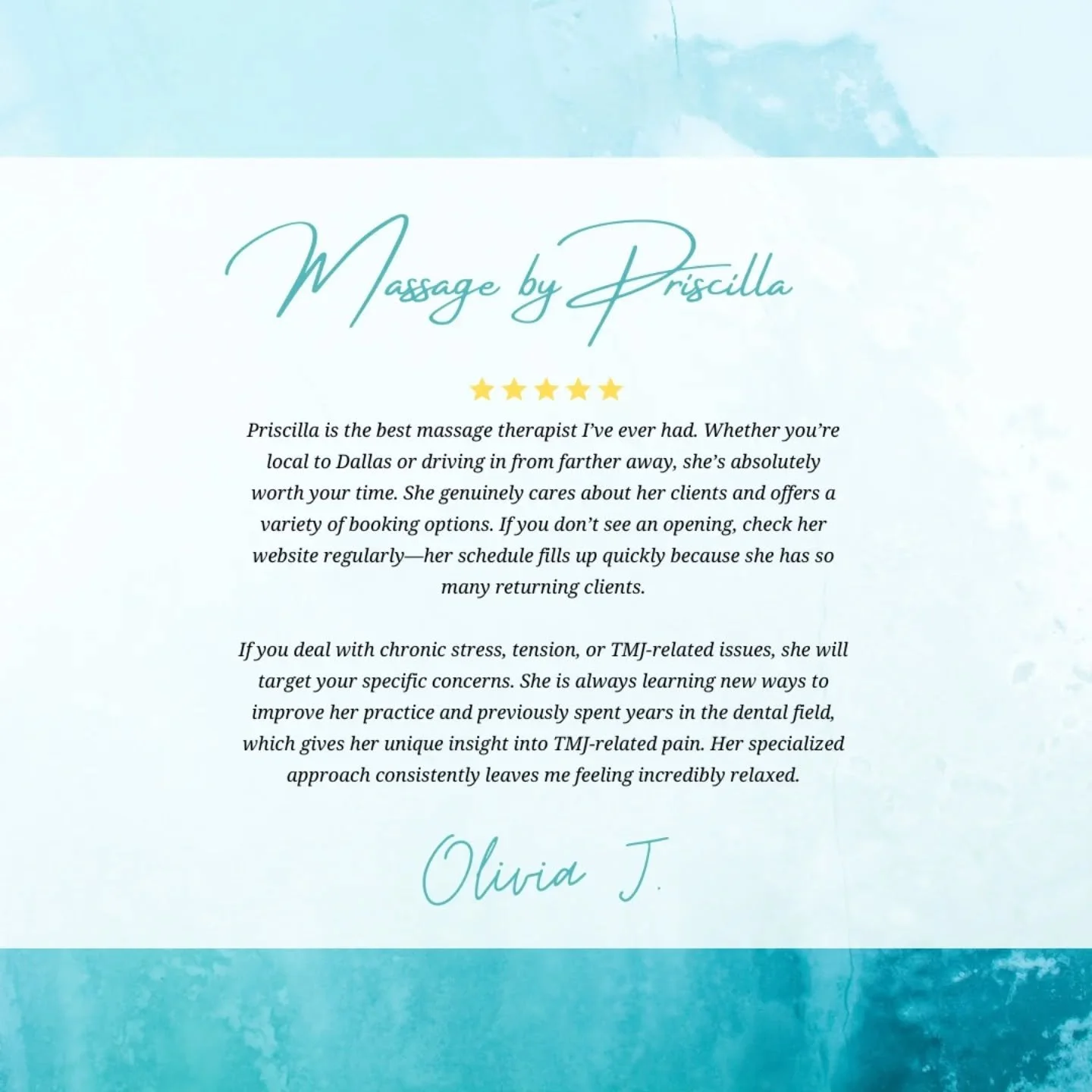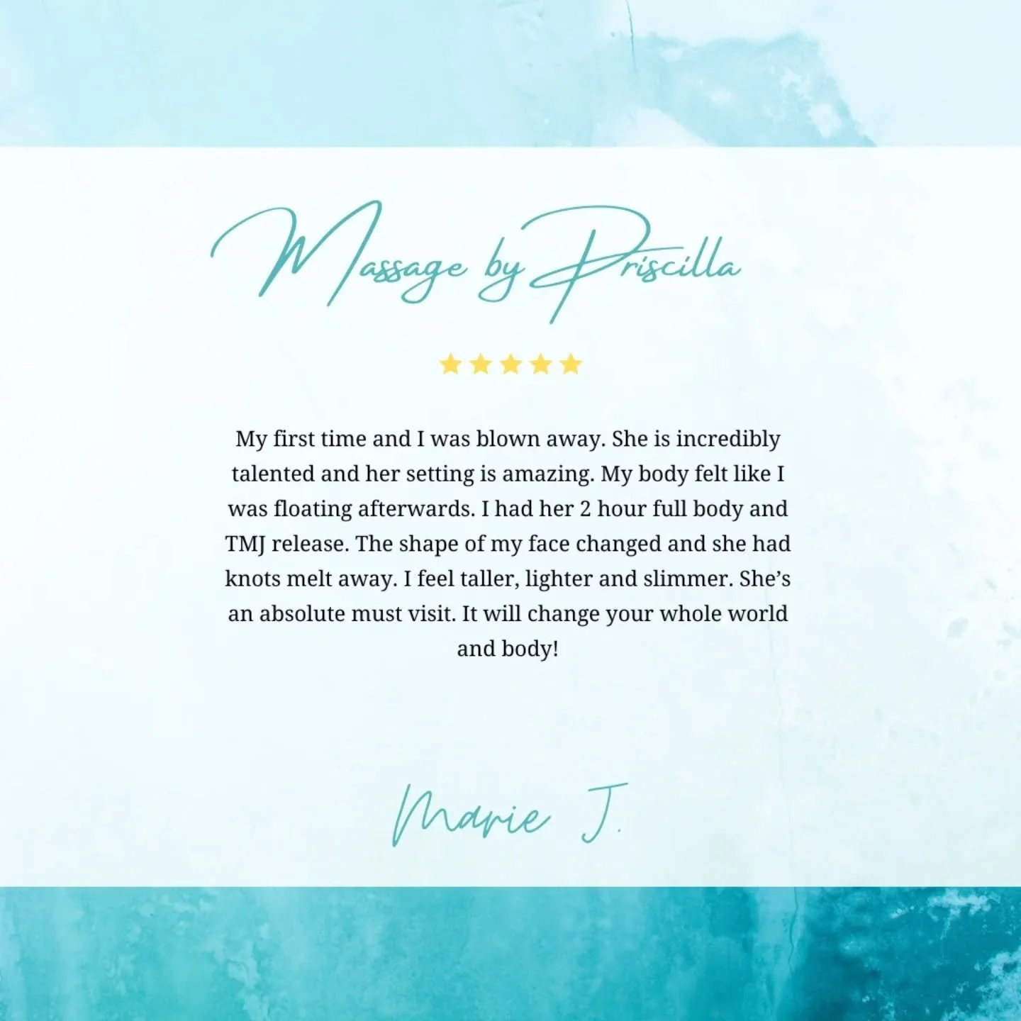 “I have had a LOT of massages in my life, but Priscilla stands out above the rest! Her attention to detail is unparalleled. Not only is she super knowledgeable and attentive, she also carries a beautiful energy that makes you feel taken care of. I left feeling amazing not only physically but emotionally and mentally as well. I can’t wait until my next visit! Give yourself the give of self care and book with Priscilla!!! I promise you won’t regret it.”
